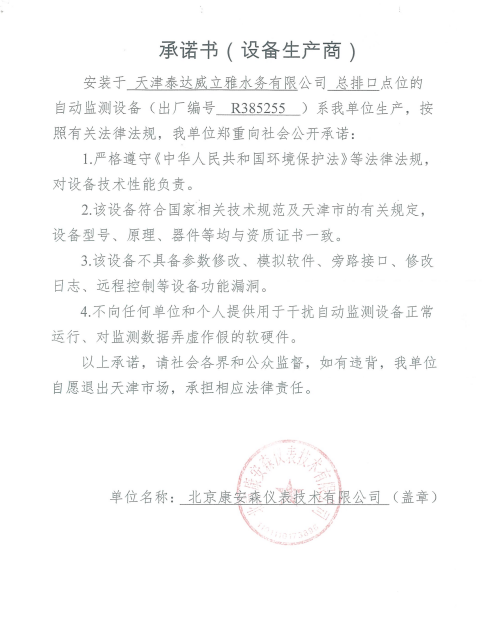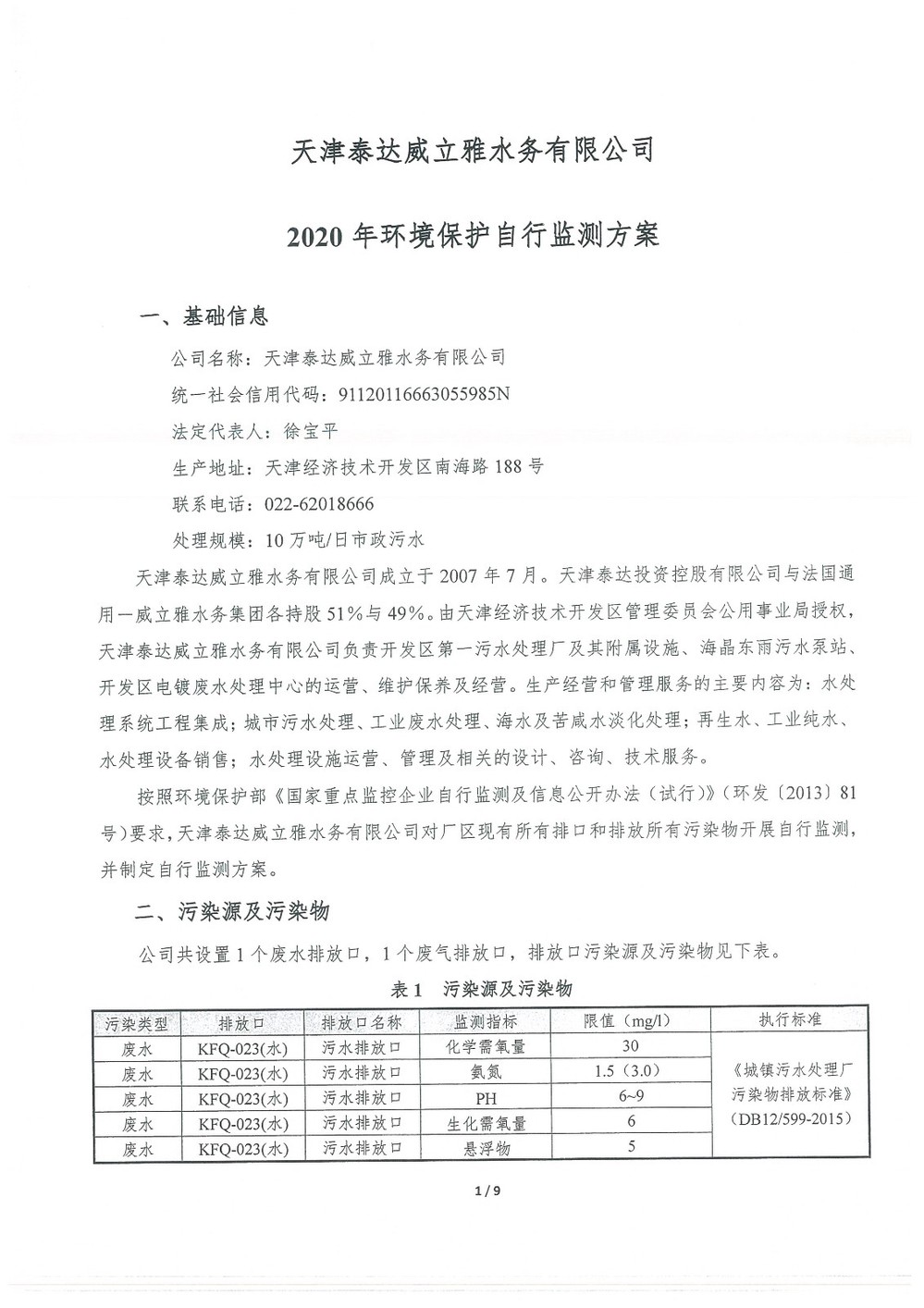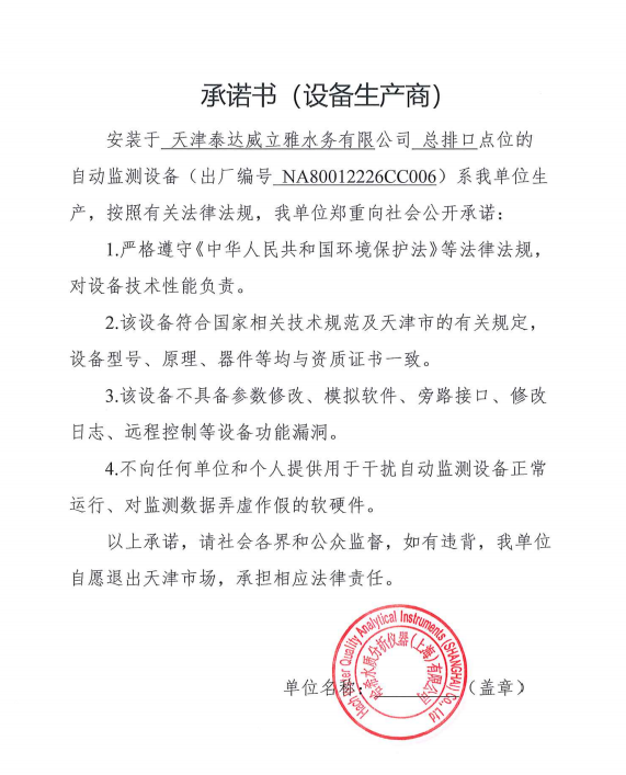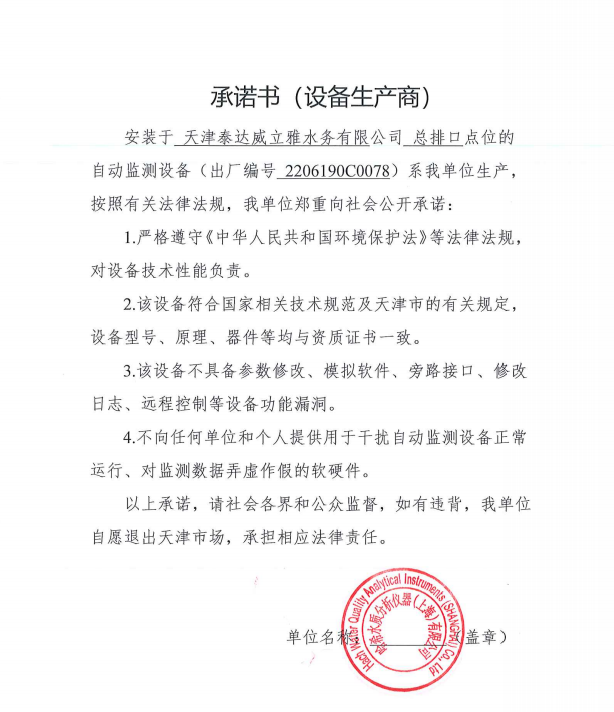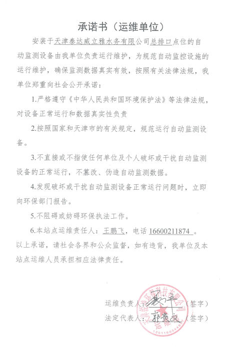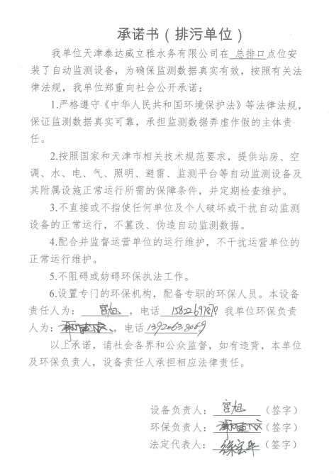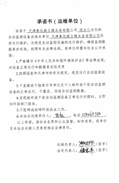 ? 公司出水指標數據經現場數據采集儀采集后直接上傳至天津開發區環保局及天津市環境監測中心。天津市環境監測中心直接將接收自公司的上傳數據發送至國家環保部。實現了對我公司出水指標數據的實時在線監控和監督管理。 自2014年,依《國家重點監控企業污染源監督性監測及信息公開辦法(試行)》,主要污染物排放情況經天津市重點企業自行檢測數據發布系統對外公布,主動接受社會公眾監督。 信息發布平臺 2025年第2季度環境信息公開:天津泰達威立雅水務有限公司 公司名稱:天津泰達威立雅水務有限公司 統一社會信用代碼:91120116663055985N 法定代表人:徐寶平 生產地址:天津經濟技術開發區南海路188號 聯系電話:022-62018666 處理規模:10萬m3/日市政污水 生產經營和管理服務的主要內容: 水處理系統工程集成;城市污水處理、工業廢水處理、海水及苦咸水淡化處理;再生水、工業純水、水處理設備銷售;水處理設施運營、管理及相關的設計、咨詢、技術服務。 其他信息: 天津泰達威立雅水務有限公司成立于2007年7月。天津泰達投資控股有限公司與法國通用-威立雅水務集團各持股51%與49%。由天津經濟技術開發區管理委員會公用事業局授權,天津泰達威立雅水務有限公司負責開發區第一污水處理廠及其附屬設施、海晶東雨污水泵站、開發區電鍍廢水處理中心的運營、維護保養及經營。 項目(出水) 平均值(mg/L) A標準(DB12/599-2015) (mg/L) 化驗次數(次) 合格率(%) 我公司排放口數量為一個,位于廠區東南側。處理后出水排入市政專用排污管道,經北排泵站排入渤海灣。2025年4-6月我公司COD、氨氮、總氮、總磷排放總量如下: 168.92 天津泰達威立雅水務有限公司為原天津經濟技術開發區污水處理廠,是天津濱海新區第一座污水處理廠,位于開發區南海路與第十二大街交口處,污水處理項目投資總額3.5534億元人民幣,占地8.1公頃,設計能力為日處理污水10萬m3,其中市政污水的比例高于60%。污水處理工藝目前采用“預處理+SBR+反硝化濾池+臭氧催化高級氧化+紫外消毒”。脫水機房、進水泵房、預處理單元和儲泥池的臭氣經過收集管道收集進入生物過濾塔除臭處理。剩余污泥經脫水機脫水處理,泥餅外運處理。工藝系統由在線儀器儀表輸送到中控室實現自動控制。 出水水質達到天津市《城鎮污水處理廠污染物排放標準》(DB12/599-2015)A排放標準。廠界噪聲均滿足《工業企業廠界噪聲標準》GB12348-2008(3類)晝、夜標準值。廠界無組織排放廢氣中臭氣濃度、氨、硫化氫濃度均符合《惡臭污染物排放標準》(GB12/059-2018)限值要求。 開發區第一污水處理廠現狀主要的大氣影響來自預處理單元(格柵與沉砂池)和污泥區(污泥脫水機房)的惡臭氣體。污泥脫水機房、污泥料倉、三合一泵房等設施產生的臭氣集中收集,儲泥池、預處理單元等采用加罩密閉設計,臭氣集中收集至生物除臭裝置,除臭效率不低于80%,處理后由15米高排氣筒達標排放。根據天津市環保局《關于天津開發區第一污水處理廠改造工程環境影響報告書的批復》,開發區第一污水處理廠的衛生防護距離設為100m。 污水廠廢氣監測結果表明,廠區周界監測點位臭氣濃度均低于20(無量綱),符合《惡臭污染物排放標準(GB12/059-2018)的標準要求。 開發區第一污水處理廠污水經處理后達到天津市《城鎮污水處理廠污染物排放標準》(DB12/599-2015)A排放標準要求。污水處理廠工藝過程本身沒有生產性廢水排放,所排污水主要為生活污水和污泥處理水,這部分廢水一同返回本污水處理廠的進水泵房,與市政污水一并處理。2025年4-6月出水達標率為100%,無超標情況。 開發區第一污水處理廠主要的噪聲設備為鼓風機,鼓風機位于鼓風機房,并設置隔音減震措施,其噪聲影響甚微。 監測結果:廠界噪聲共設置4個噪聲監測點,執行《工業企業廠界環境噪聲排放標準》(GB12348-2008)3類標準,根據監測結果,各廠界處噪聲均符合執行標準要求。 污水廠運行過程中產生的固體廢棄物主要為柵渣、沉砂、污泥及生活垃圾。生活垃圾和柵渣交由開發區環衛綜合服務公司清運處理;產生的脫水污泥委托天津恒基環境工程有限公司和天津萬德生物工程有限公司進行資源化、無害化、減量化處理。 編 號 名 稱 發 布 單 位 批號 時 間 1 《關于天津經濟技術開發區10萬噸/日污水處理廠項目環境影響報告書的批復》 天津市環境保護局 津環保管 (1998)第43號 1998.2.18 2 《關于天津開發區污水處理廠改造工程環境影響報告表的批復》 天津經濟技術開發區 環境保護局 津開環評 【2008】198號 2008.12.8 3 《天津經濟技術開發區環境保護局關于天津經濟技術開發區第一污水處理廠提標改造工程環境影響報告書的批復》 天津經濟技術開發區 環境保護局 津開環評書 【2017】18號 2017.8.30 我公司根據《中華人民共和國環境保護法》以及《天津市突發事件總體應急預案》等相關文件要求,于2019年1月編制(修訂)完成了《天津泰達威立雅水務有限公司突發環境事件應急預案》,于 2022年7月19日完成變更備案并發布(備案編號:120116-KF-2022-117-L)。 天津泰達威立雅水務有限公司 2025年7月8日